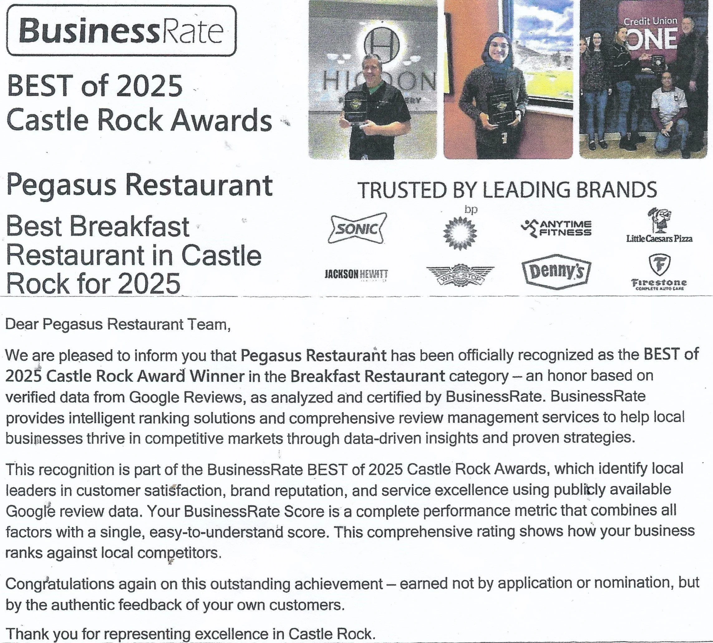 Pegasus' mission is simple — provide an incredible selection of food that's made fresh and priced right. We feature some great dishes from around the globe. Everything from great American staples, Greek classics and Mexican-inspired entrees, all served by the Torres family brothers. Whether it is breakfast, lunch or brunch we are sure to have something everyone can enjoy.